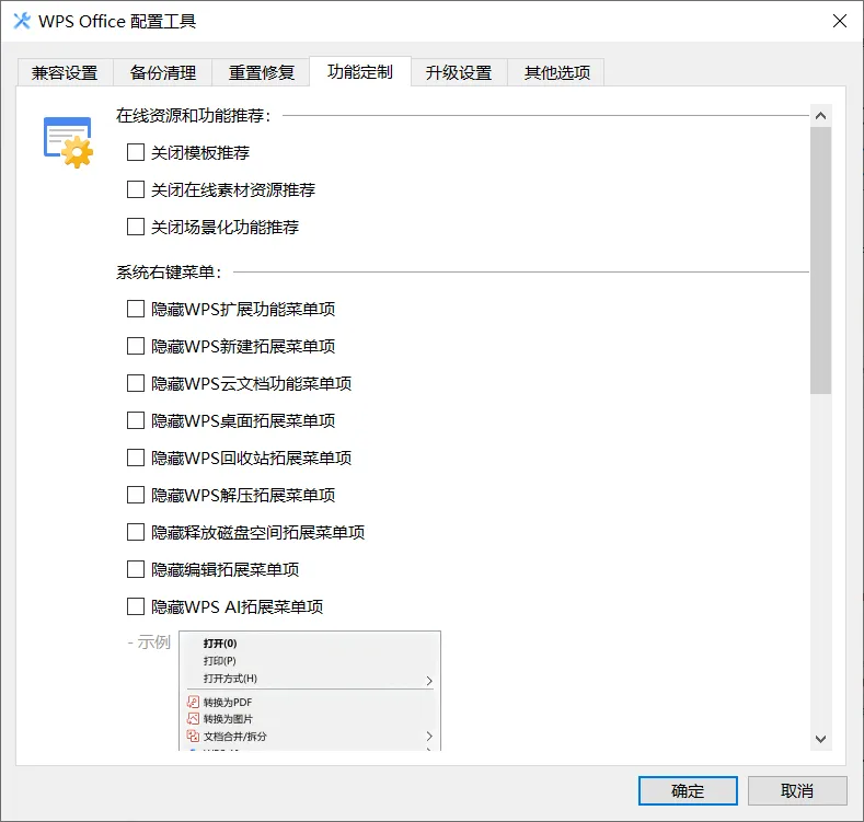 一些右键菜单和不想要的功能也可以在“功能定制”里面关闭。