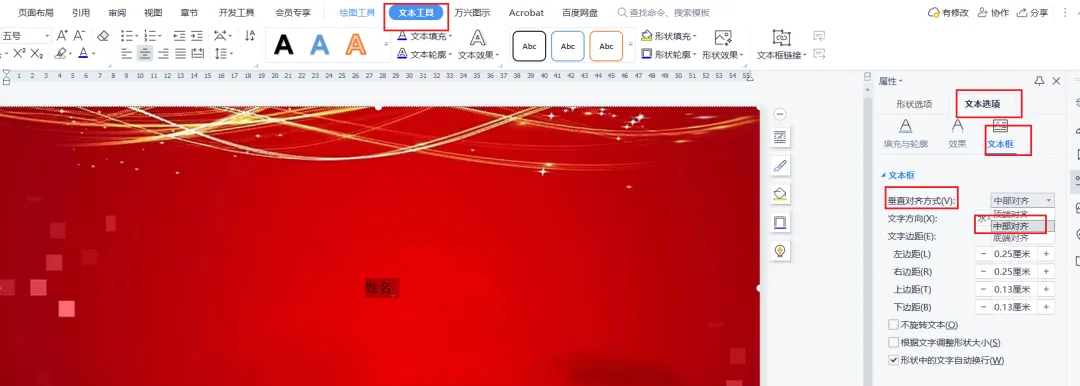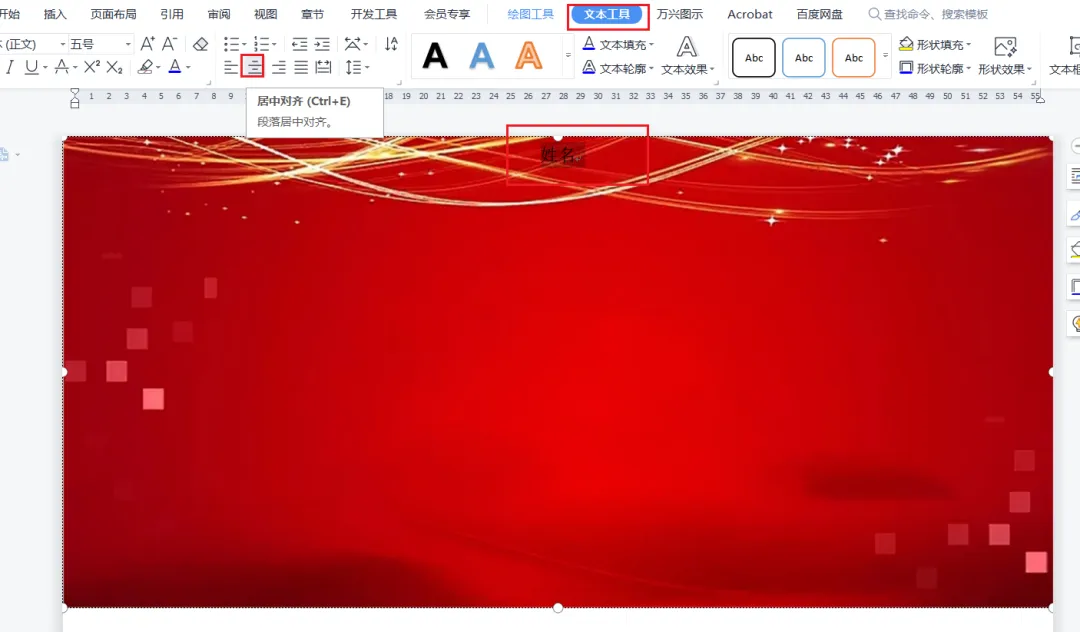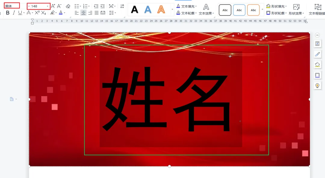 然后设置文字内容,设置文字进行占位,如输入姓名,然后选择水平居中和垂直居中对齐文字,并修改文字大小