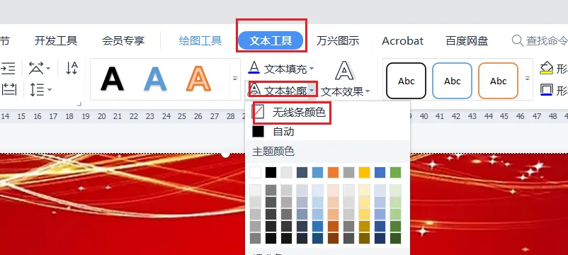 然后取消为文本框的轮廓,选中文本框后选择文本轮廓的颜色为无线条颜色
