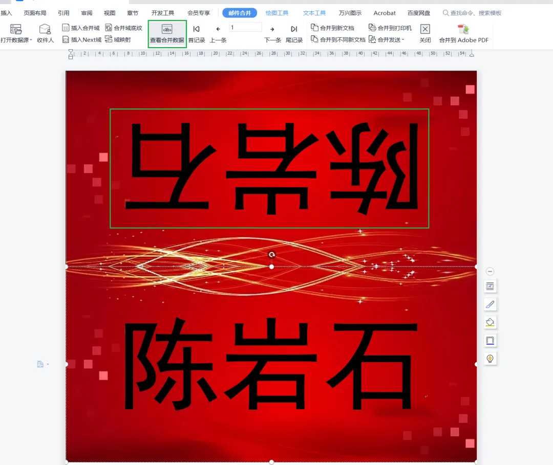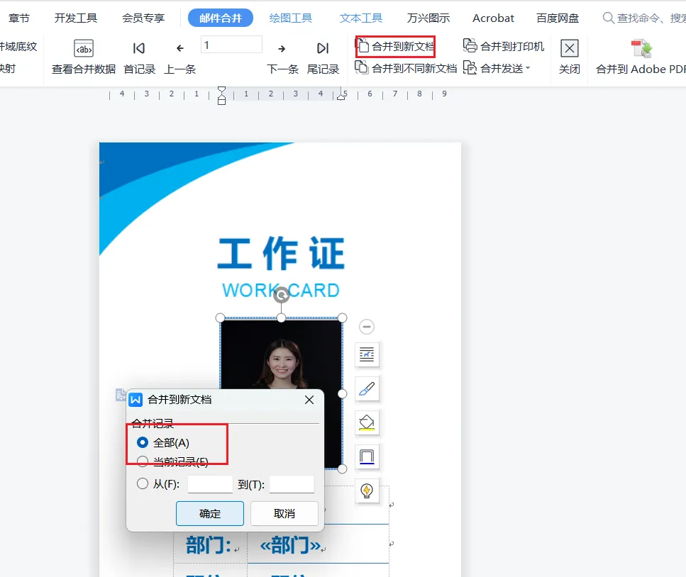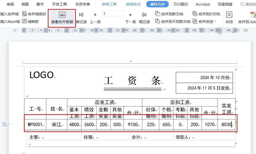 将第一份产出的数据源和第二份主文档进行邮件合并。