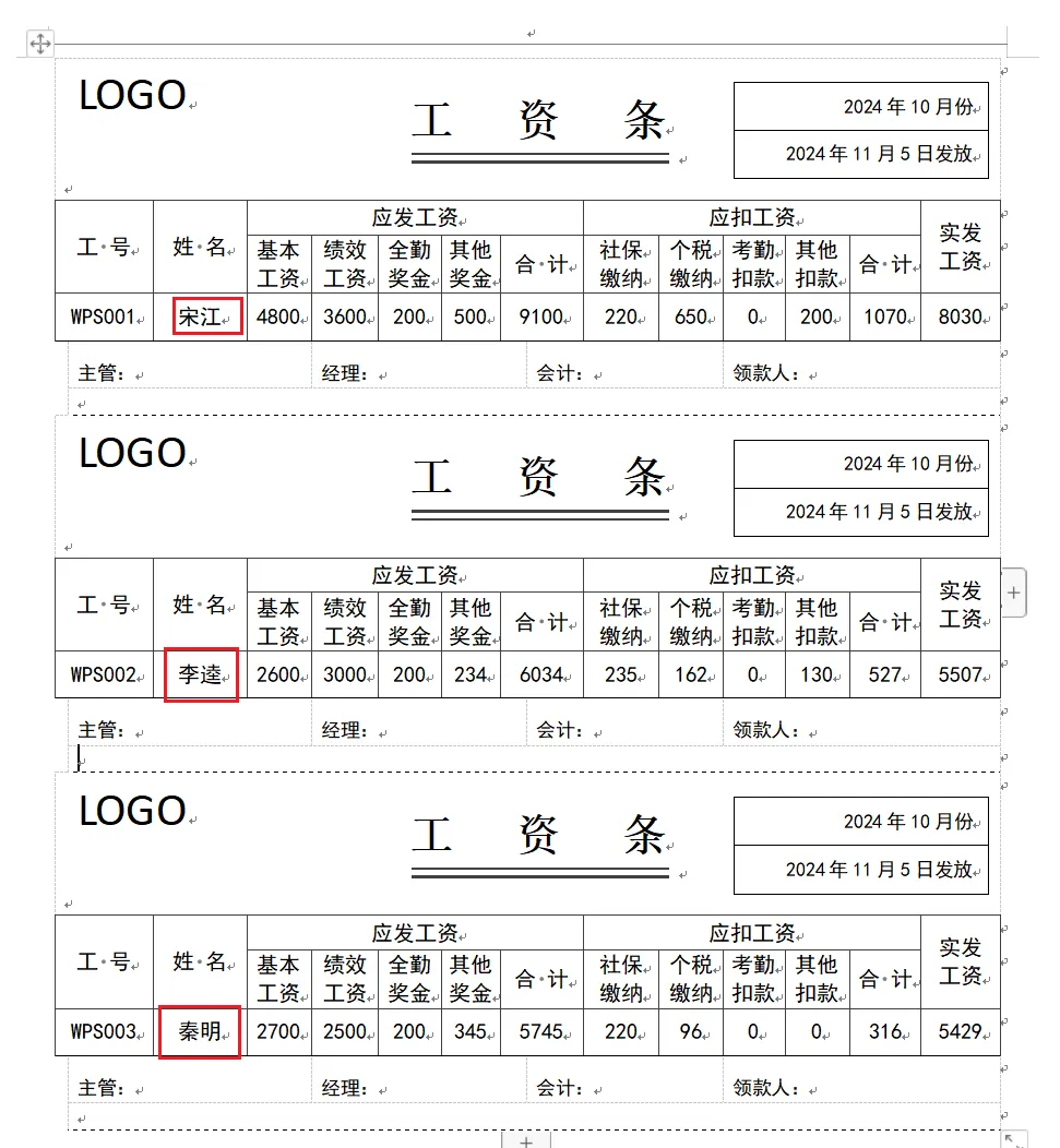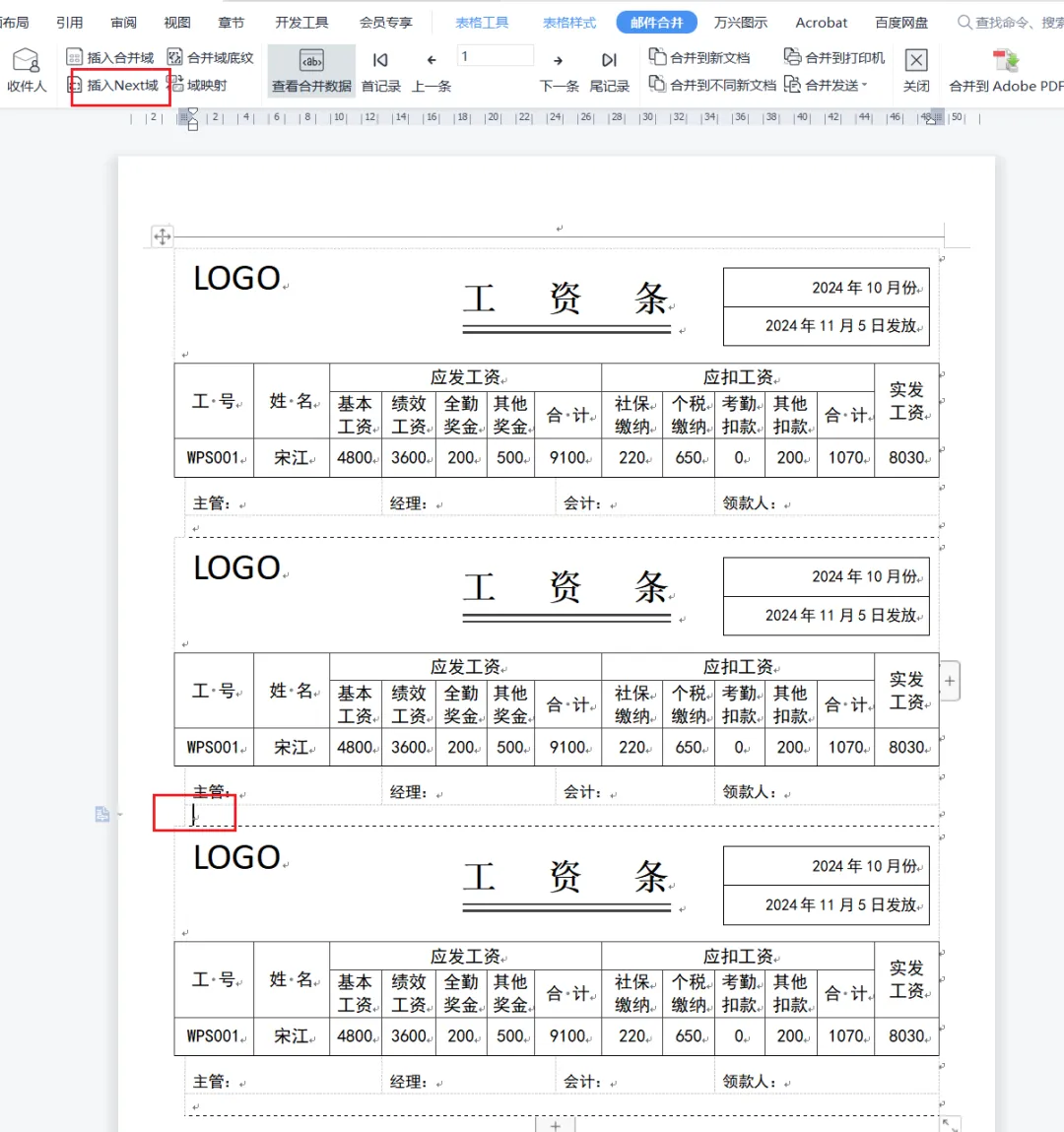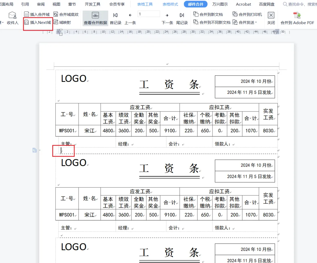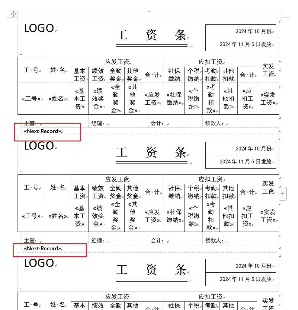 然后实现一张纸,需要三张不同的工资条的效果,使用【插入NEXT域】