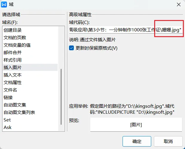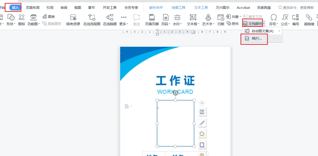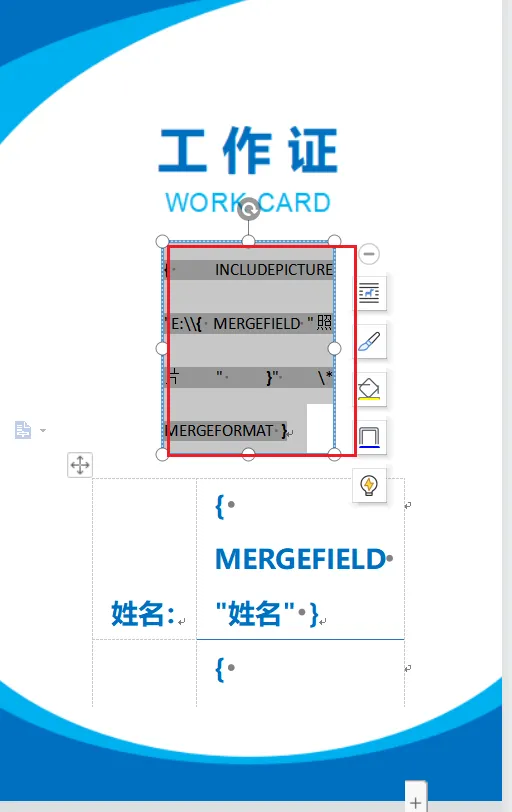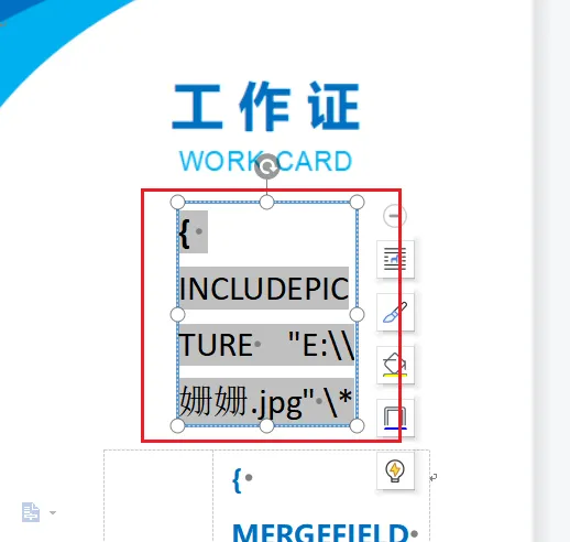 使用邮件合并做到批量插入工作证照片,事先插入图片域,编辑好域代码后再在图片中插入“照片”合并域