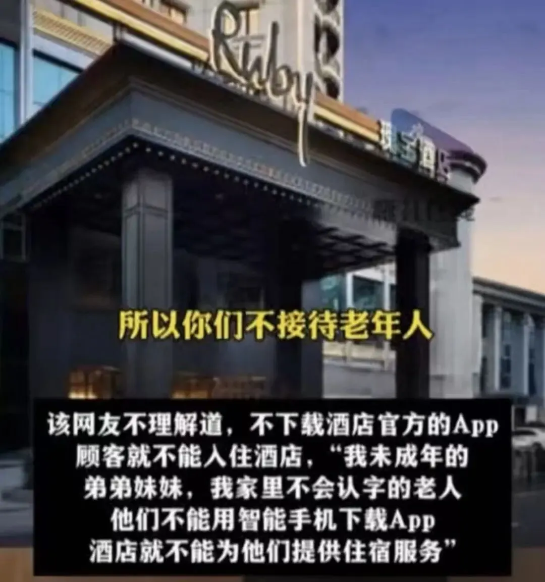 近日,网友称自己带老人、小孩去浙江宁波某酒店入住,被告知“不接受下载酒店App就不能入住酒店”,引发关注。该网友不理解道,不下载酒店官方的App顾客就不能入住酒店,“我未成年的弟弟妹妹,我家里不会认字的老人,他们不能用智能手机下载App,酒店就不能为他们提供住宿服务”。据悉,该网友入住的酒店为宁波老外滩RubyBella瑰宝酒店,商户主体为“宁波开元曼菲酒店管理有限公司”。天眼查显示,该公司属于开元酒店集团,主公司为“浙江开元酒店管理股份有限公司”,成员企业73家。