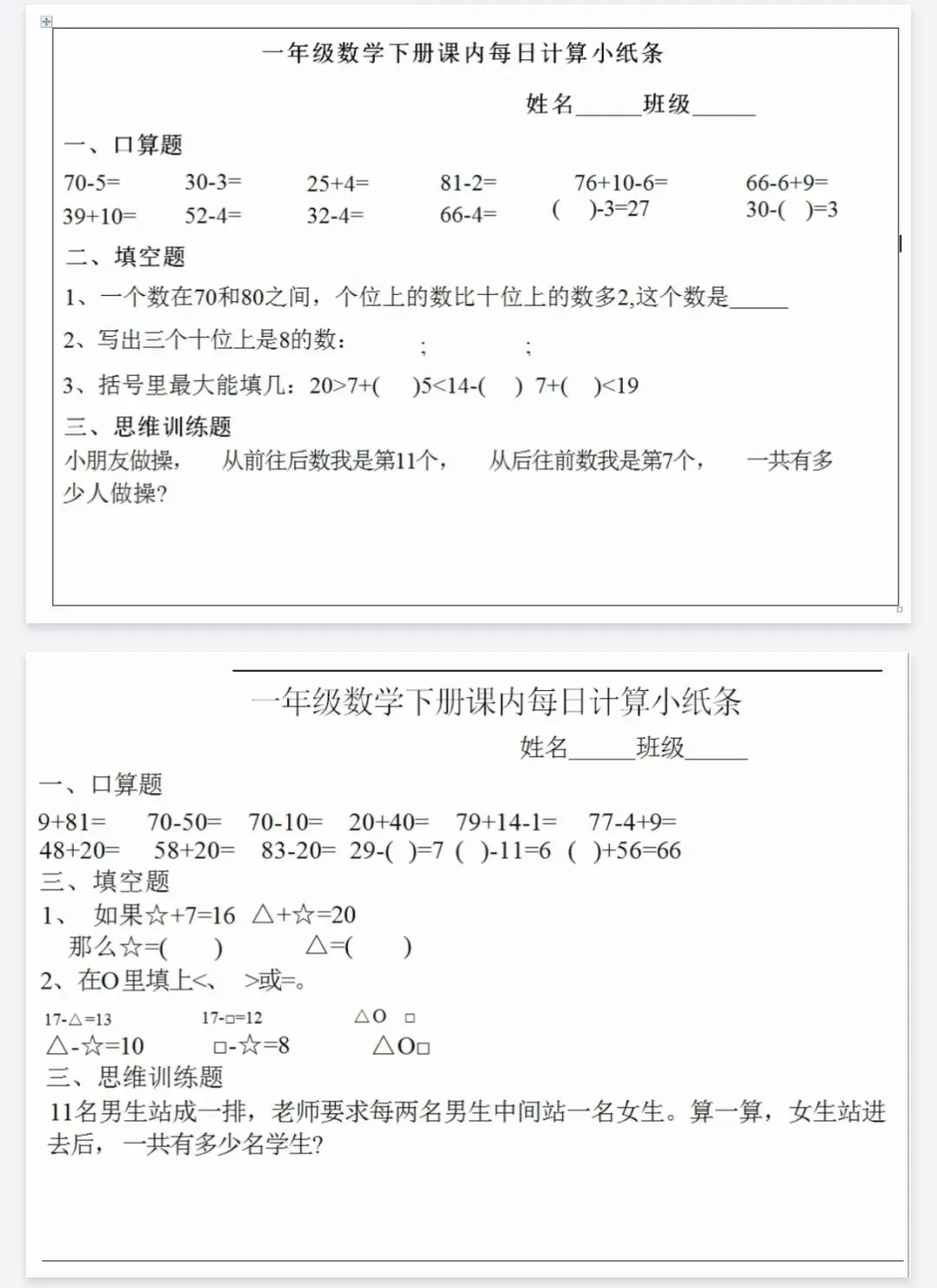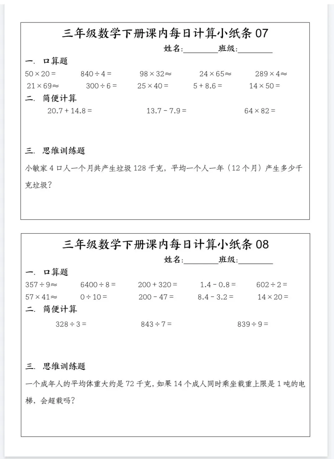 课内每日计算小纸条
