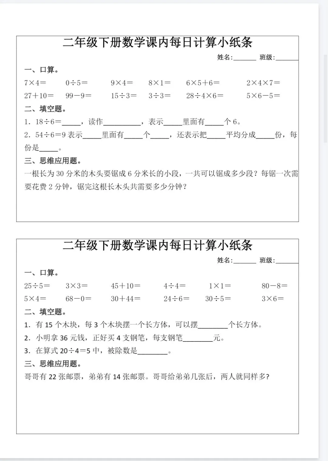 🏅二年级下册数学课内每日计算小纸条.pdf