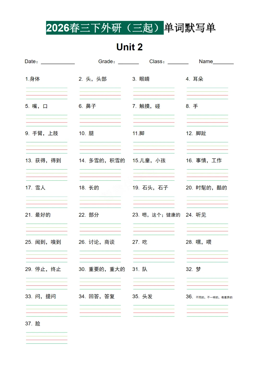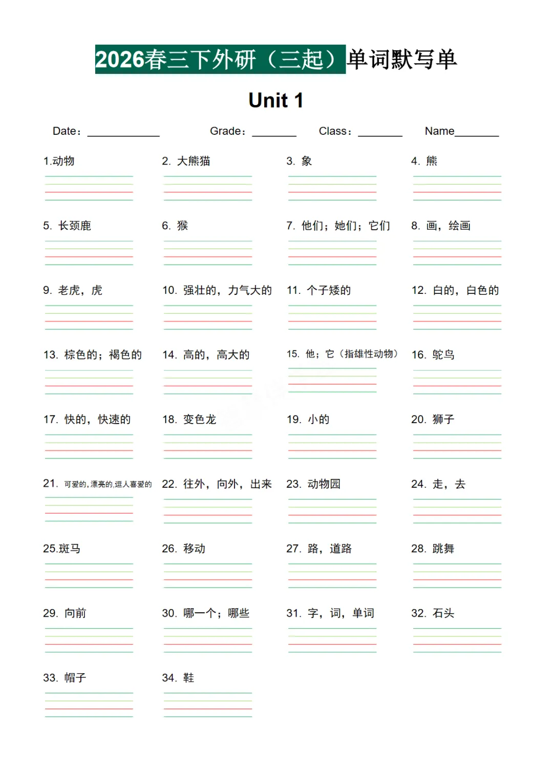 【免费下载】三年级(下)英语 2026春-单词默写单《外研版(三起点)》,PDF电子版,共7页,可打印