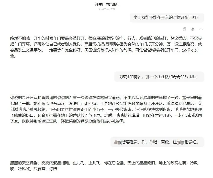 大家都知道,要是你的车没有后枕屏的视频遛娃功能,长途旅行哪怕只有两个小时,娃也很容易烦躁。他会来来回回坐不住,甚至可能做出一些极端行为,比如开车门、离开安全座椅跑到前排探探风,或是解开安全带等。这时候我们就会呼出豆包,让里面的交警叔叔智能体告诉娃,这种行为对不对、有没有危险。