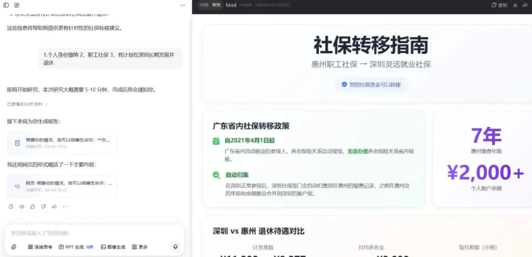 豆包的深度研究功能,基本上是我解决疑难杂症的最佳窗口。比如说一些政府最新发布的信息、税务通告,又或者是五险一金、社保转移等处理方法,遇到这类与政府强相关的公文时,因为有些公文有年限限制或地方差异限制,直接找这些文档的话,你得访问多个政府网站才能得到最佳答案。但使用豆包的深入思考功能后,就能快速get到这些内容,还能快速获取到通告的原文,这种对效率的提升真的是杠杠的,而且还给你提供一个HTML可视化起来。