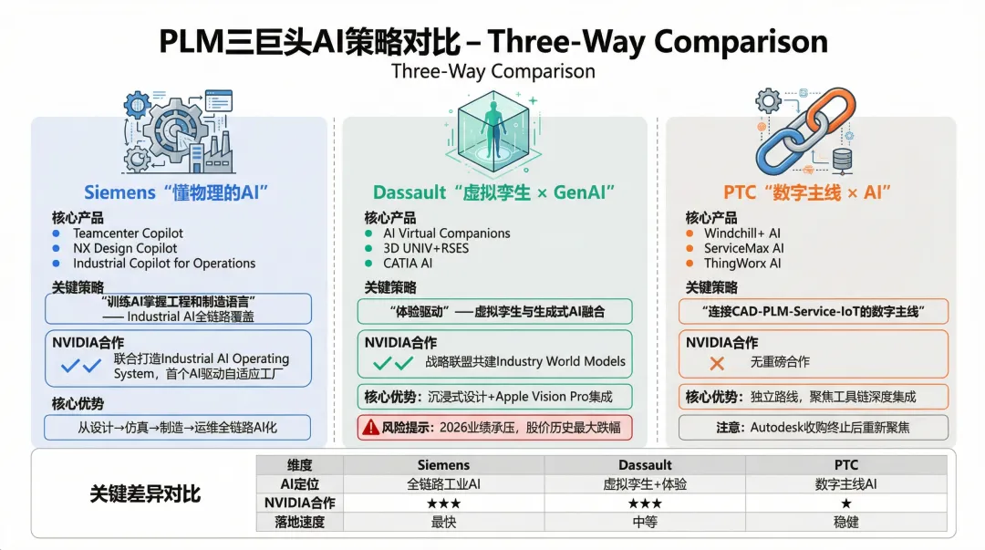 点评: PTC 的优势在于「连接 CAD-PLM-Service-IoT 的数字主线」。在 Autodesk 收购案搁浅后,PTC 需要更加聚焦于将 AI 深度嵌入已有工具链,而非分散精力。Onshape 作为云原生 CAD 对中小企业的吸引力值得关注。