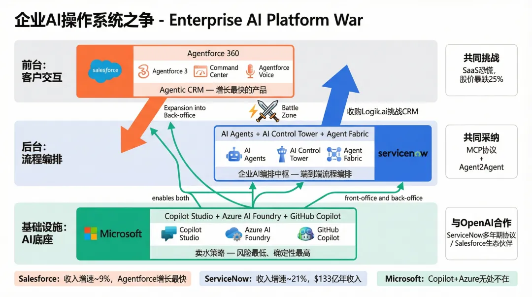 • • 「Agent 大战」叙事兴起: 行业分析开始将 Salesforce vs ServiceNow 定义为「企业 AI 操作系统」之争——Salesforce 主攻前台(客户交互),ServiceNow 主攻后台(流程编排),双方都在向对方领地扩张。