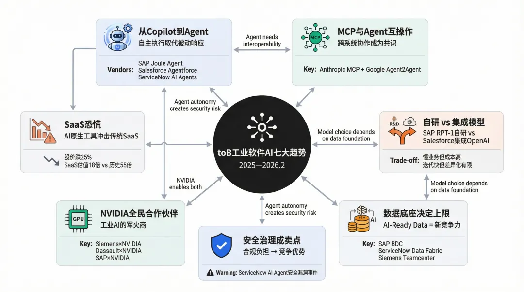 2025 年初,各厂商的 AI 产品主要是「Copilot」(AI 助手,人类主导)。到年末,几乎所有厂商都转向「Agent」(AI 自主执行,人类监督)。SAP 的 Joule Agent、Salesforce 的 Agentforce、ServiceNow 的 AI Agents、Siemens 的 Industrial Agent——命名不同,方向一致。