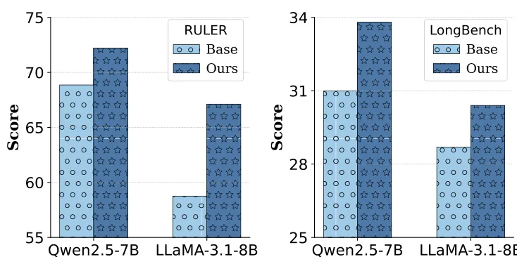 如图 3 所示,我们的方法在 RULER 上取得了实质性提升,且增益随上下文长度(32K 到 128K)增加而增大。在 LongBench v2 上也有稳步改进,这证明了重建训练在处理真实 QA 任务中的有效性。