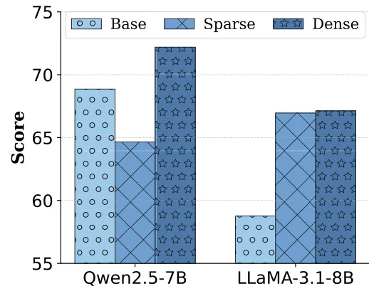 比较式 (1) 的密集奖励与仅在全对时给 1 分的稀疏奖励。实验发现(图 4),稀疏奖励会导致训练不稳定,特别是在 Qwen2.5 模型上表现显著下降。