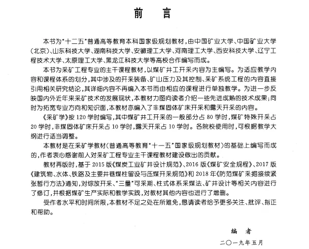 采矿学PDF以煤矿井工开采内容为主,并兼顾非煤固体矿床开采和露天开采,系统阐述了以煤炭为主的固体矿床的开采技术、工艺、理论和方法,概括了我国煤矿生产和建设中的最新成果、技术标准、经验和开采技术。煤矿井工开采内容包括采煤工艺、回采巷道布置、准备方式、井田开拓、矿井开采设计和特殊开采方法。非煤固体矿床开采内容包括矿床划分和开拓、采矿工艺和方法。露天开采内容包括采杨要索、工艺系统、开拓运输、开采境界和生产能力。