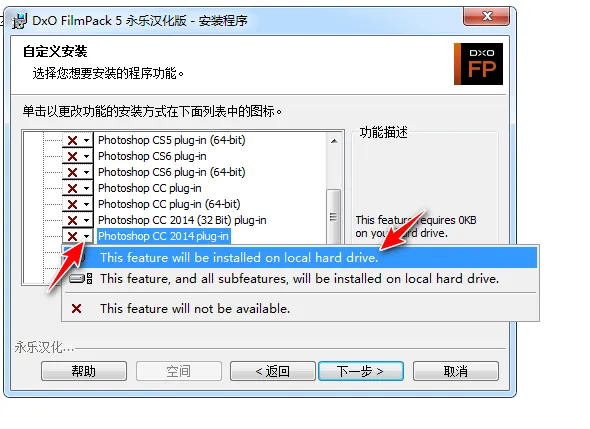 5、根据自己计算机上的photoshop软件版本选择对应版本的软件(Photoshop CC及以上版本选择photoshop CC 2014plug-in),然后单击前方的倒三角,在下拉菜单下单击“This feature will be instlled on local hardware”;