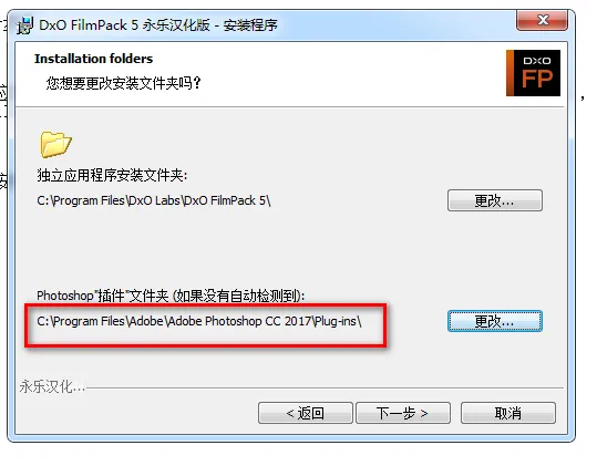 7、单击“更改”,然后找到本机photoshop软件的安装目录下的plu-gins 文件夹(右击桌面上软件的图标在下拉菜单栏里单击打开文件位置即可找到软件的安装位置),选中它即可;