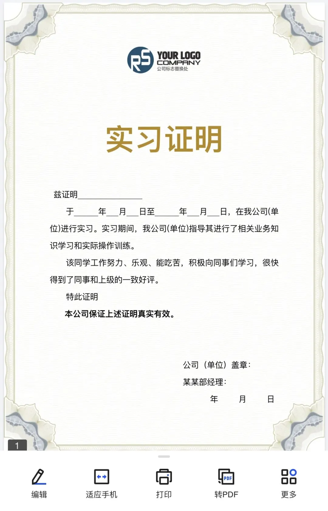 大学生实习证明word电子版可打印
