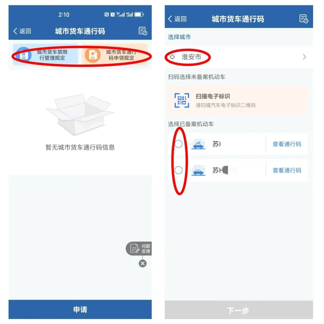 第二步:仔细阅读《城市货车禁限行管理规定》及《城市货车通行码申领规定》,点击下方“申请”,选择城市和已备案机动车后点击“下一步”,即可进入申领。