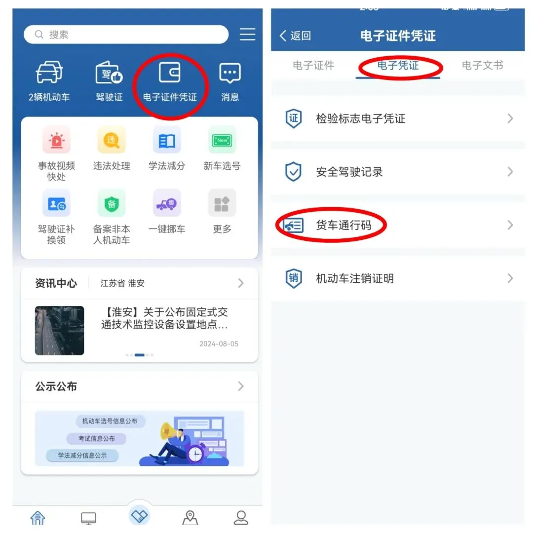 第一步:登录“交管12123”APP,依次点击“电子证件凭证”-“电子凭证”-“货车通行码”,进入申请界面。