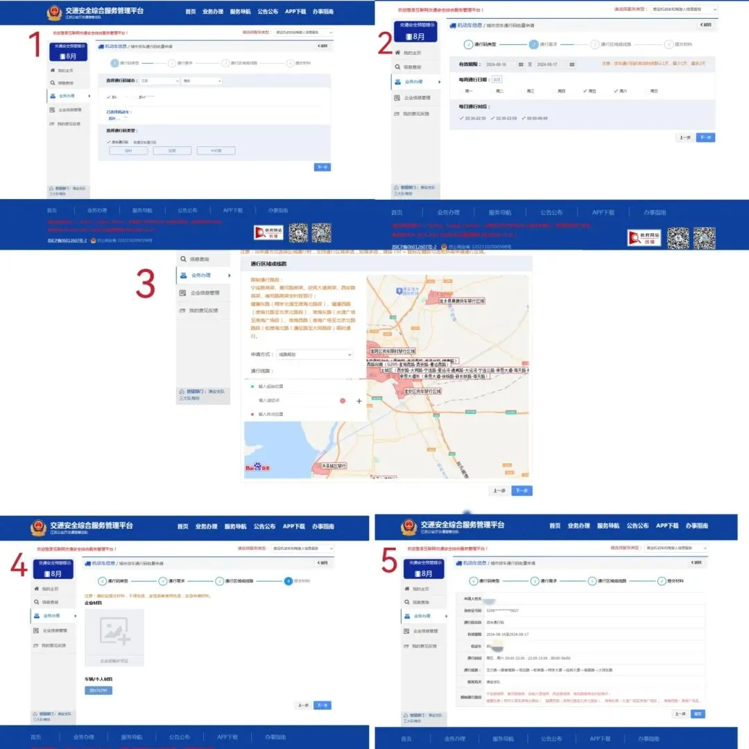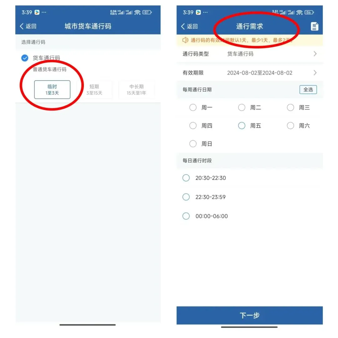 第三步:根据自身需求,依次选择申请车辆、通行码类型、通行日期、时段及路线,并上传相关材料,即可提交申请。