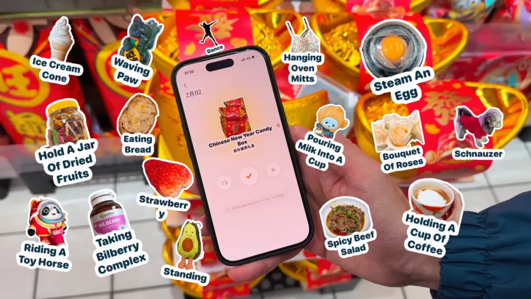 你只要对着身边的东西咔嚓一下,它就会瞬间识别物体,然后通过一个丝滑的抠图动画,把它变成一张贴纸,配上发音和例句。