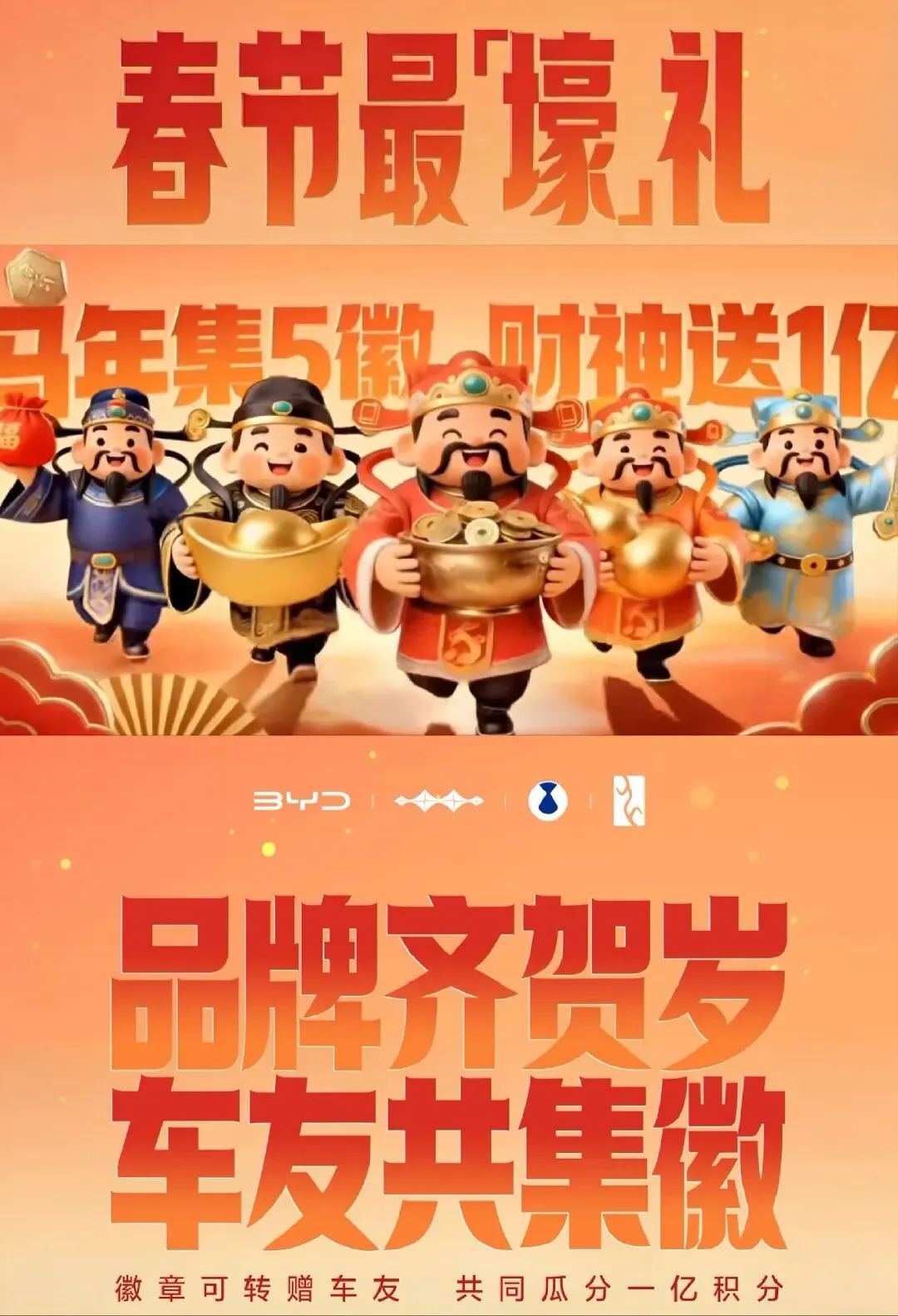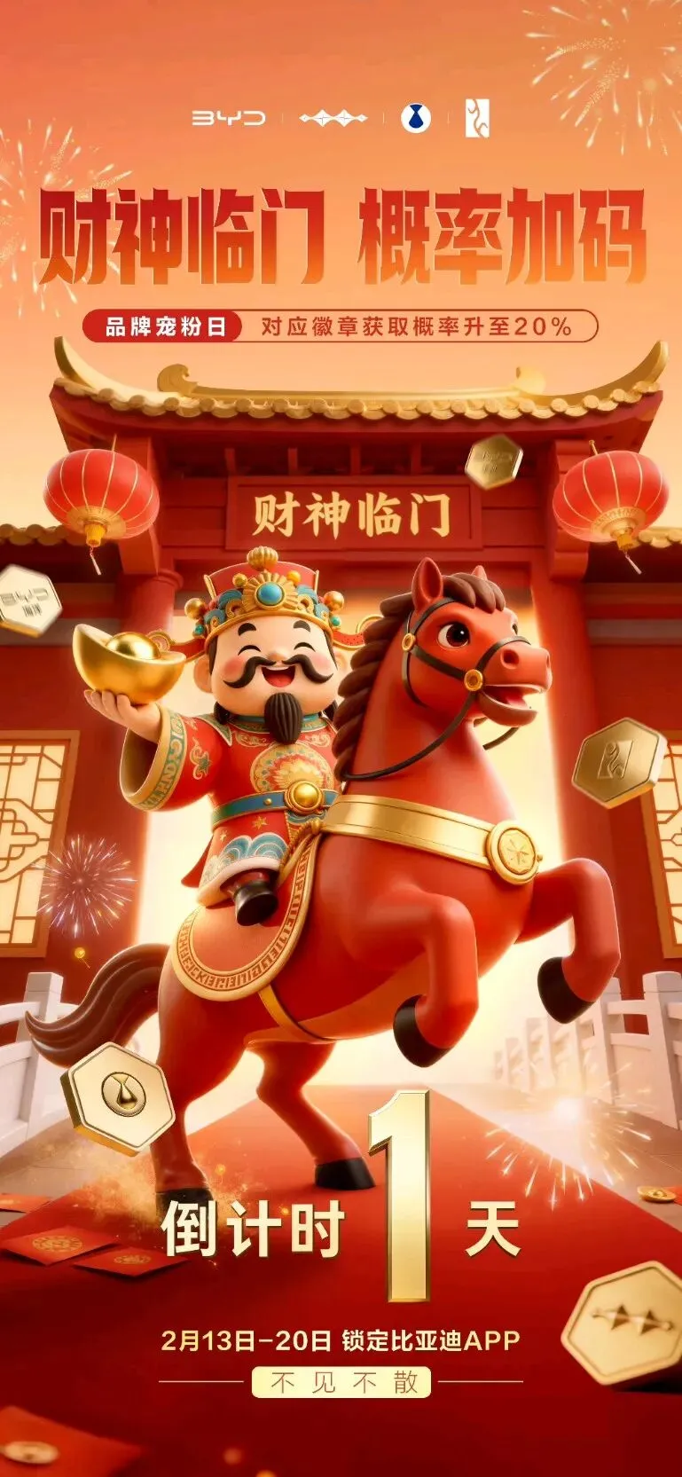 2月13-20日,锁定比亚迪APP瓜分1亿积分 马年春节将至 这个新年,来比亚迪APP集五徽啦! 怕集不齐?帮你加码助力!👍👍👍 王朝、海洋、方程豹、腾势、仰望🎁 五大宠粉日,徽章概率直接 UP↑ 活动明日开启,不见不散~👏👏👏 关注首席👇不错过更多精彩分享