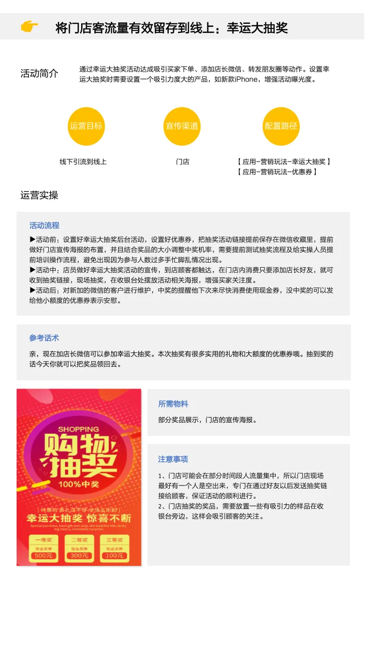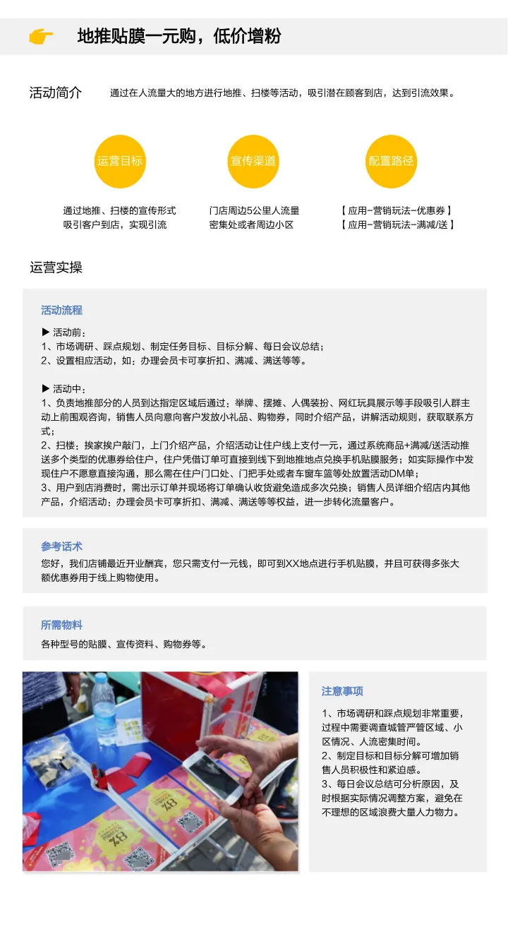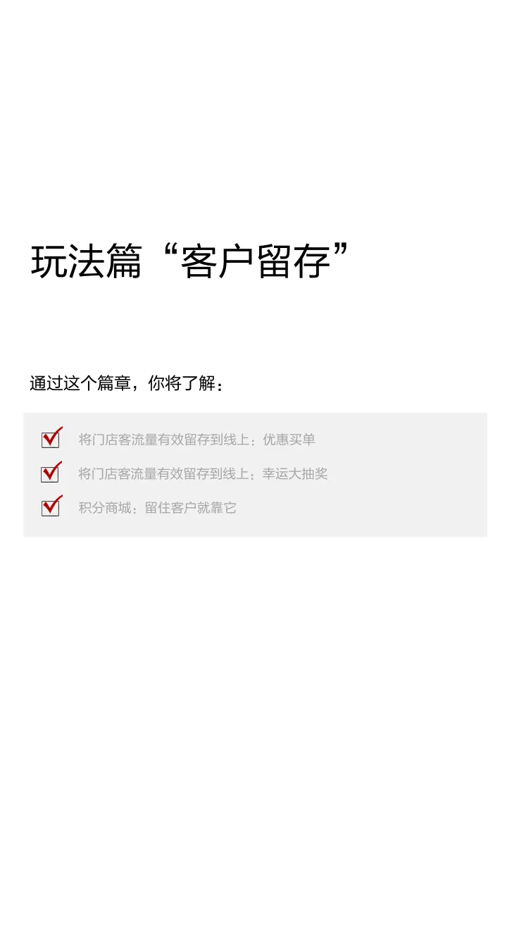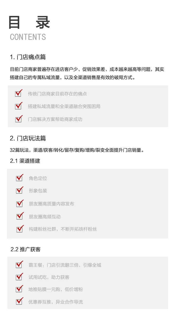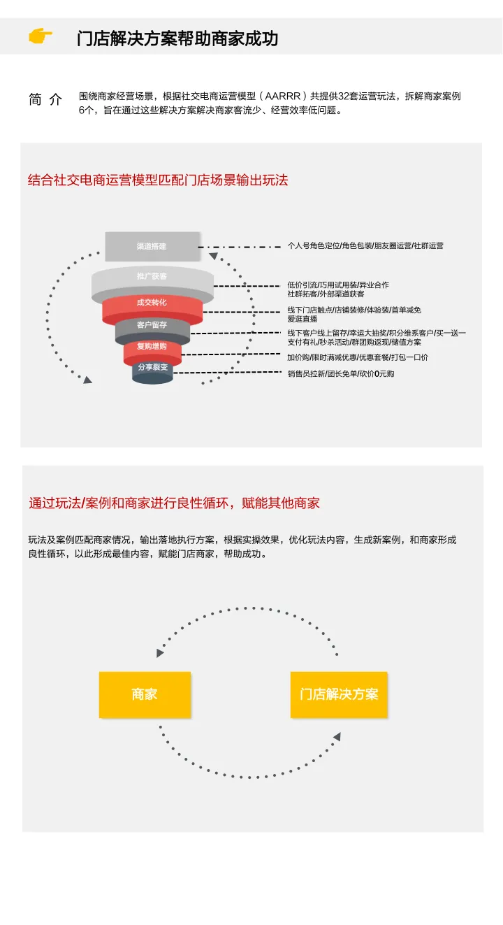 本篇为您提供一份门店运营私域解决方案,方案涉及渠道搭建,推广获客,成交转化,客户留存,客户复购,客户增购,分享裂变等多个维度,对于门店运营很有参考价值,感兴趣文末获取完整版PPT!