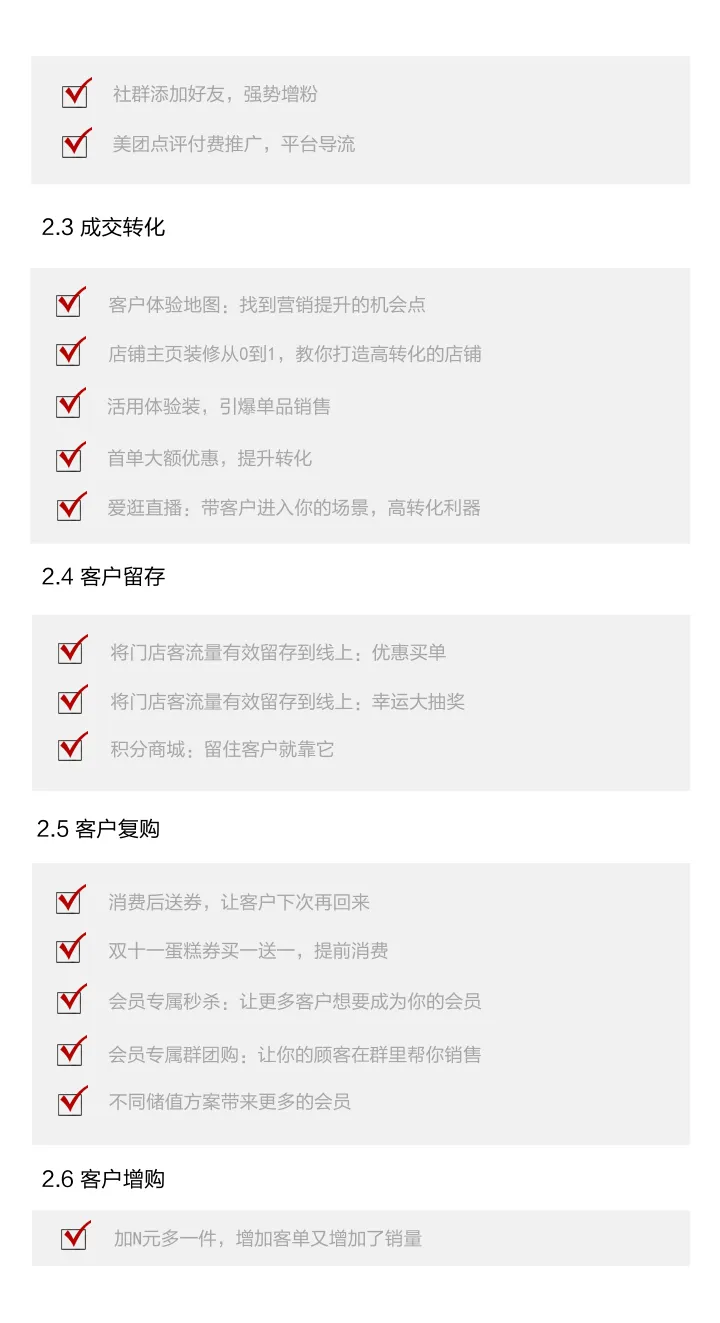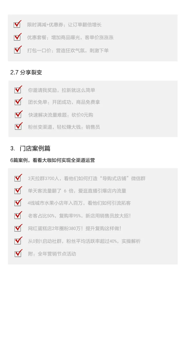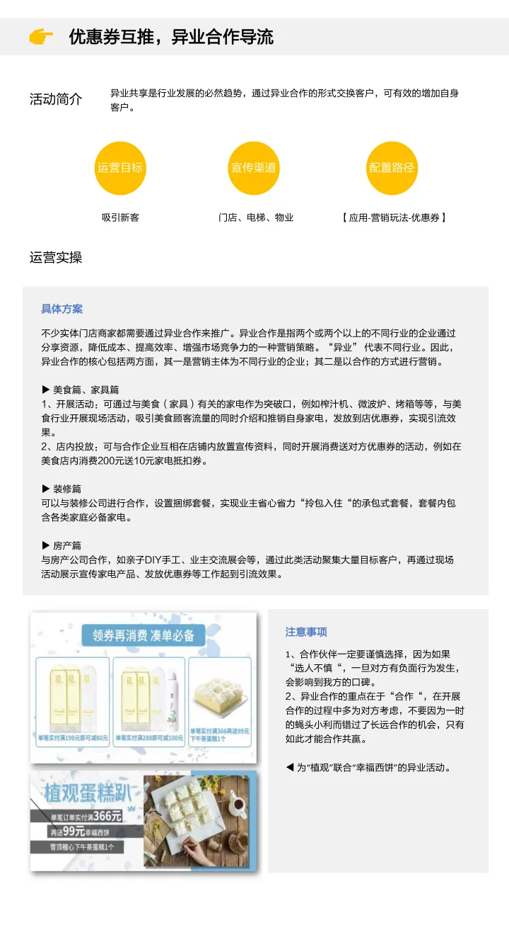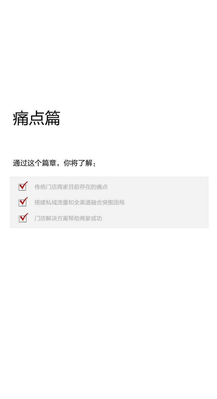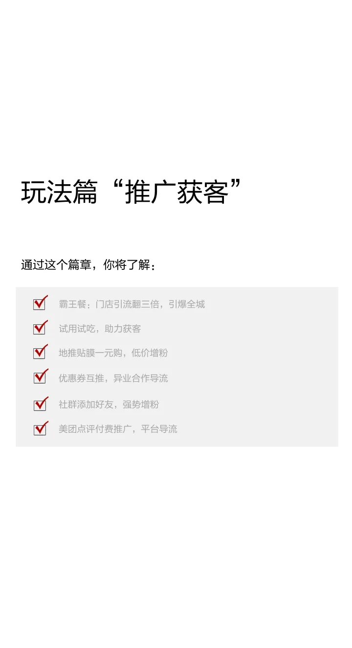 本篇为您提供一份门店运营私域解决方案,方案涉及渠道搭建,推广获客,成交转化,客户留存,客户复购,客户增购,分享裂变等多个维度,对于门店运营很有参考价值,感兴趣文末获取完整版PPT!