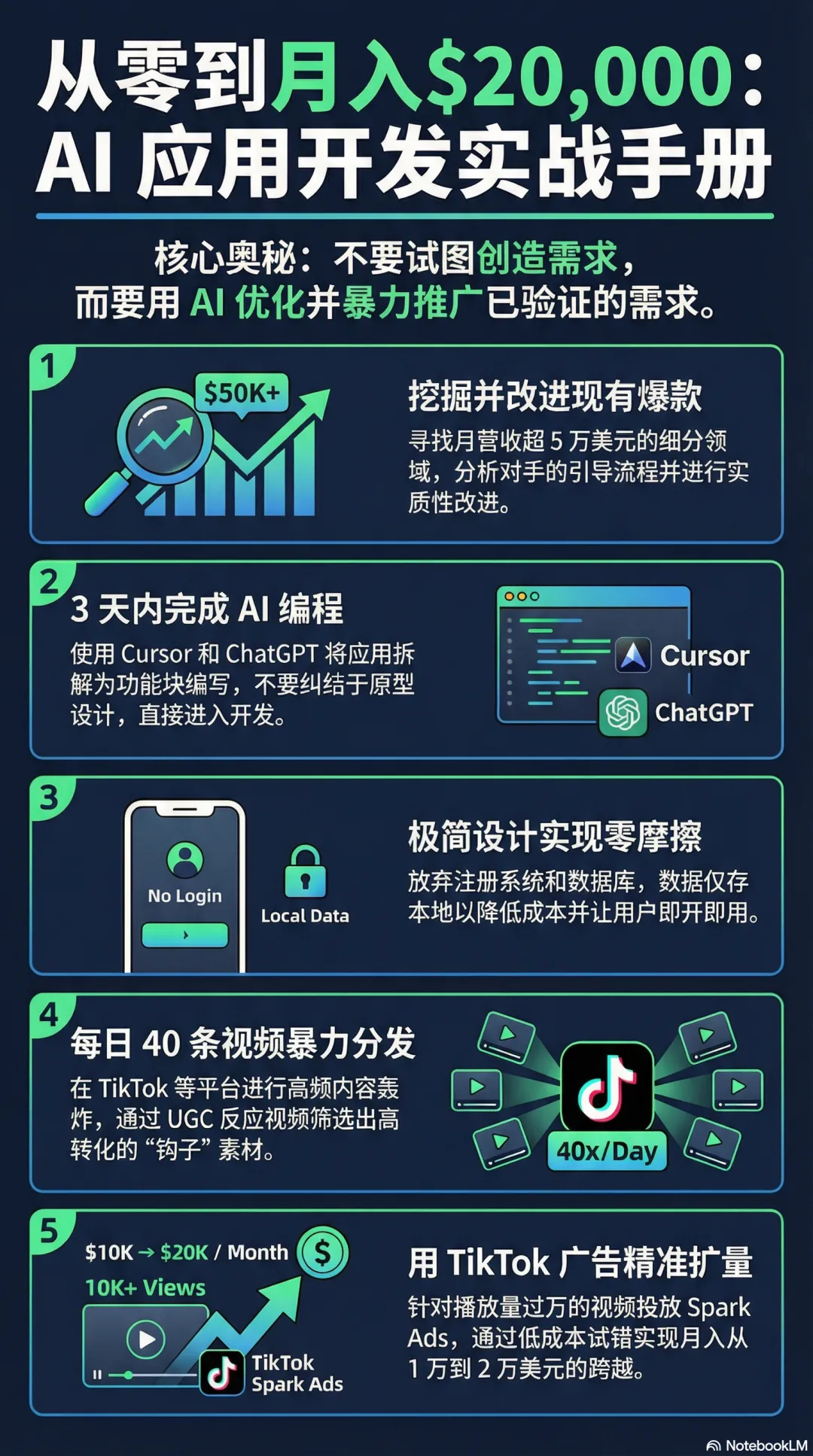 4. 停止开发,专注分发: App上线后,Mal已经3个月没写过一行新代码了。开发者往往沉迷于加功能,但赚钱靠的是每天发20条视频。