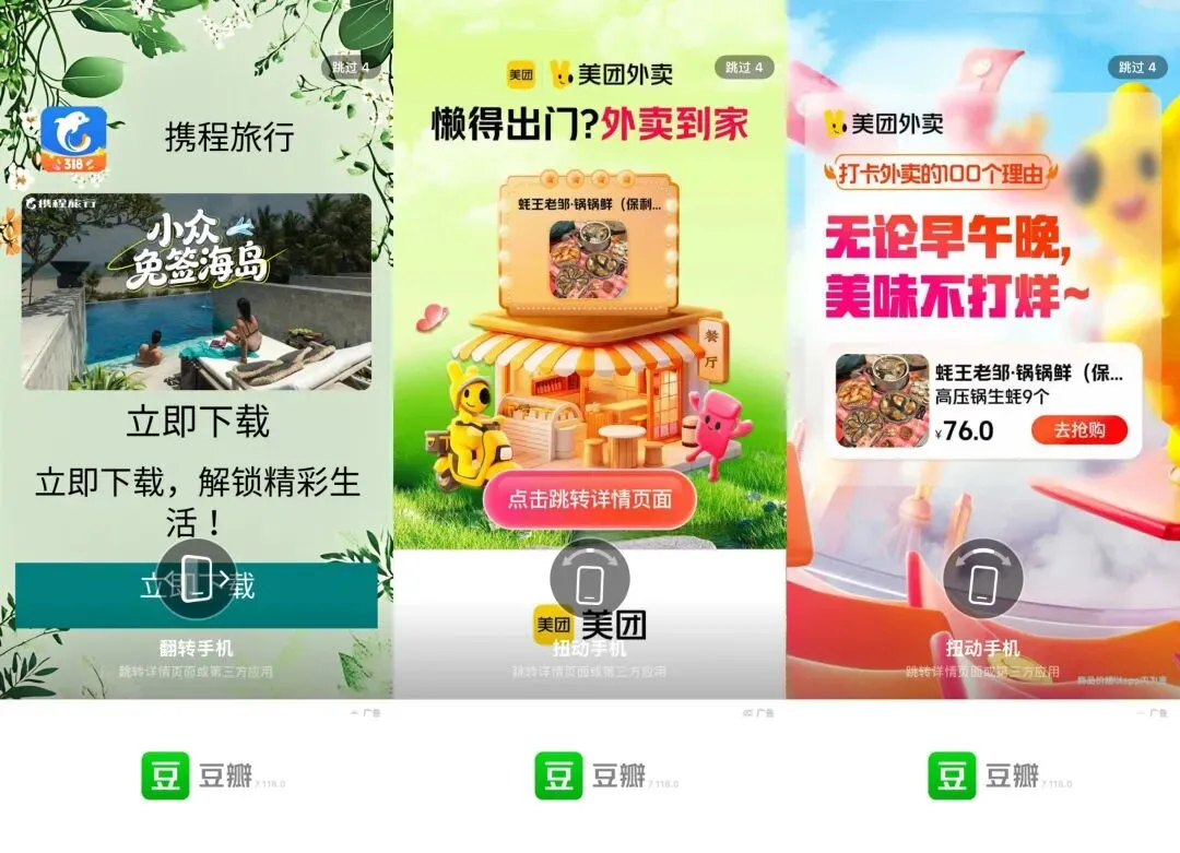 现在的豆瓣广告,从开屏讲起,最让人难以忍受的不是广告本身,而是广告的质量。