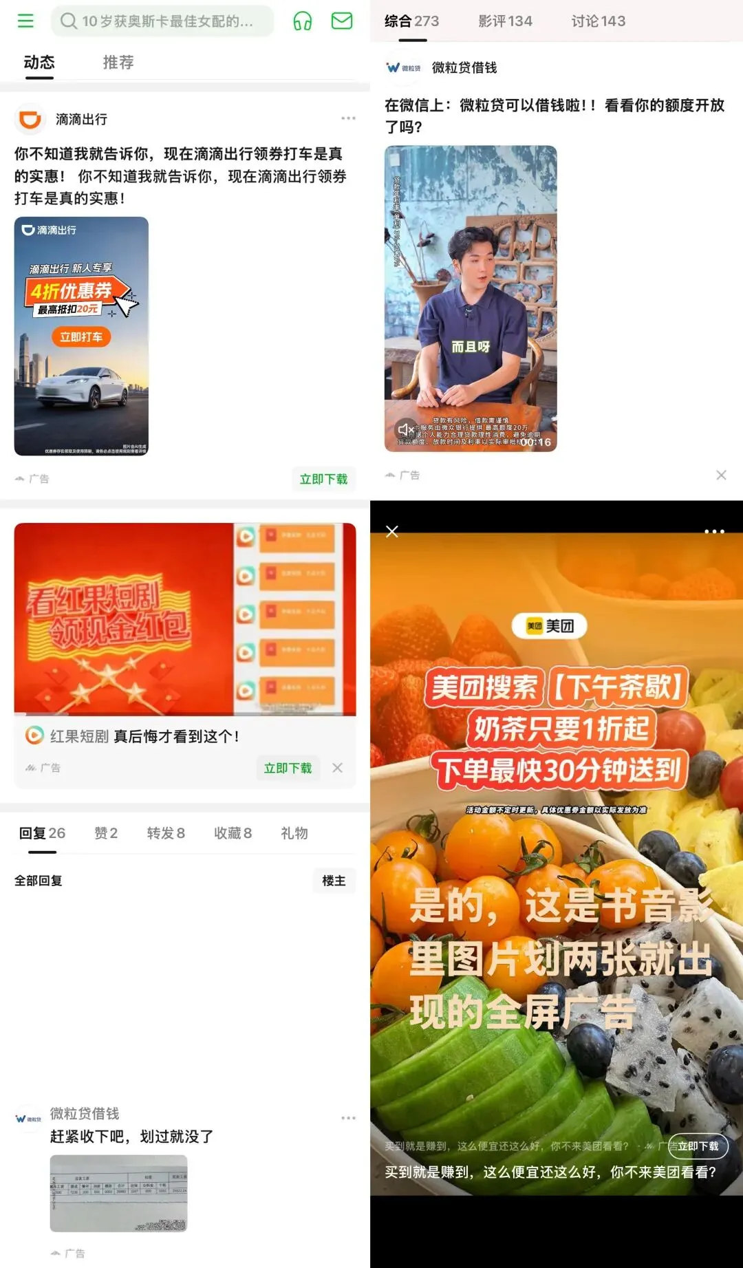 更讽刺的是,微博因为家大业大,投放的品牌多样。你能看到新手机、新车、新奢侈品、各种影视宣发,哪怕广告多,不说时髦,至少“像样”。