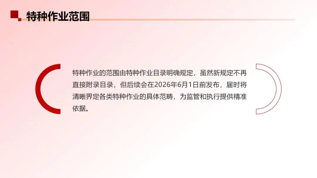 原规定附件包含《特种作业目录》,明确 11 类特种作业具体范围。新规定不再附特种作业目录,具体的目录会在2026年6月1日前新规定实施前发布。