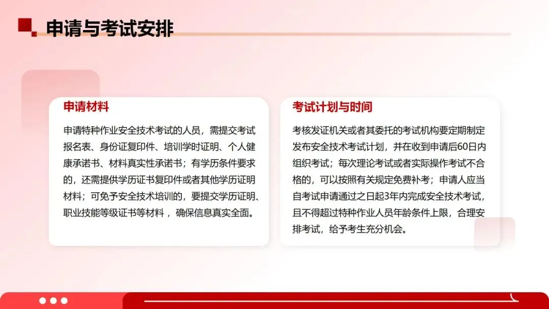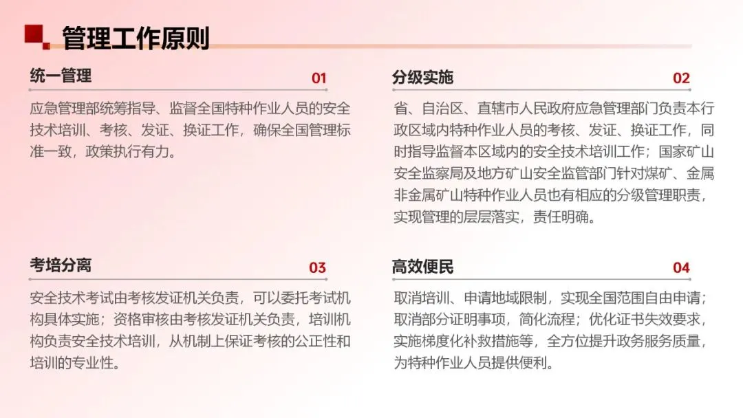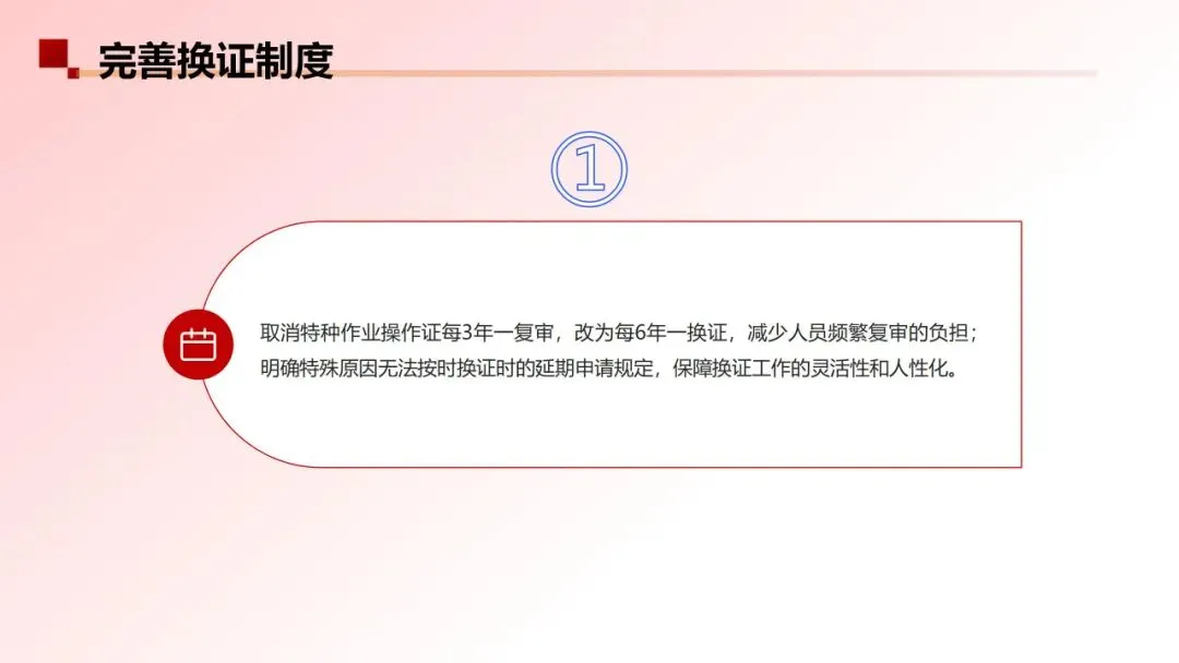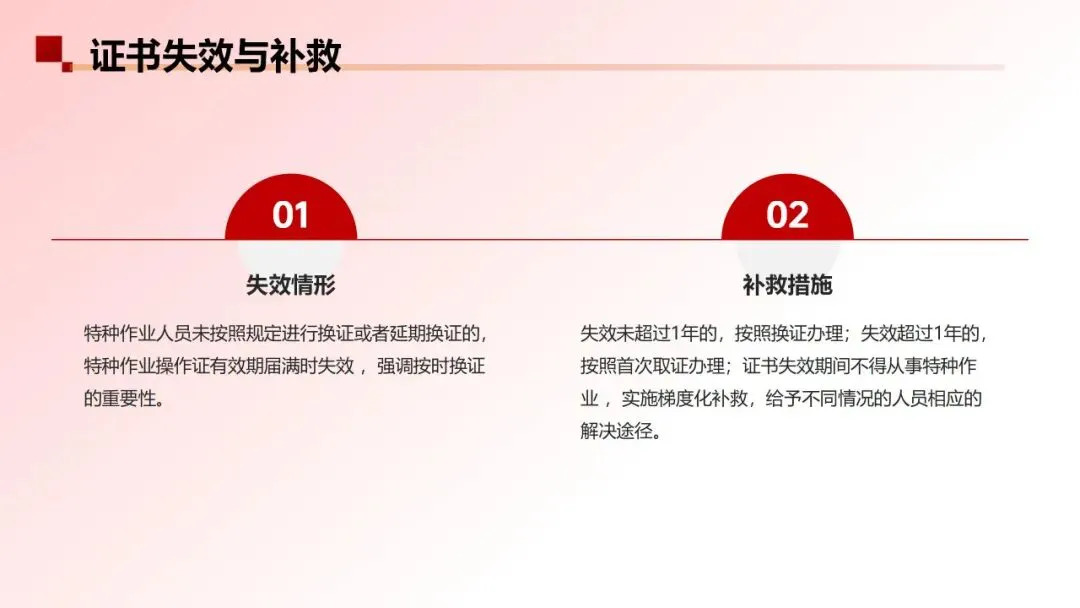 由原先规定“未按期复审即失效,需重新培训考试”的“一刀切失效”到新规定的“梯度化补救”,区分了失效时长:未按照本规定进行换证或者延期换证的,特种作业操作证有效期届满时失效,需要继续从事特种作业的,失效未超1年:按正常换证流程办理;失效超1年:按首次取证办理。