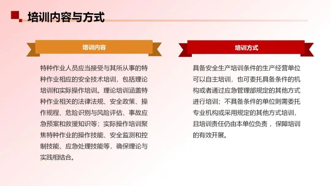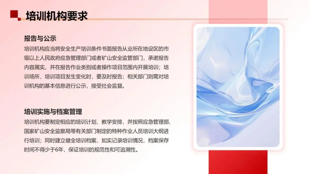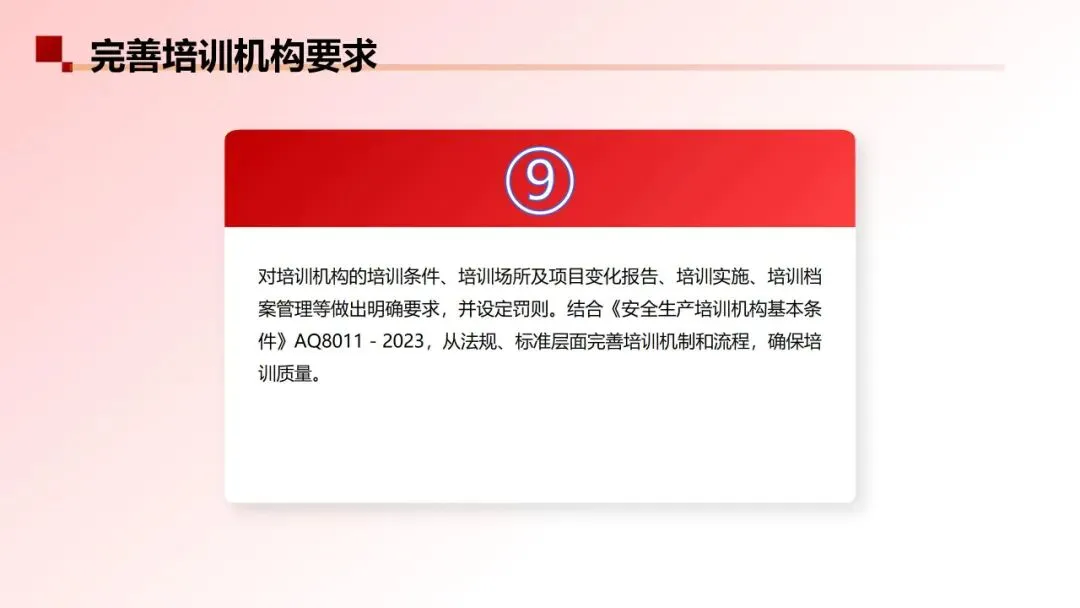 分别从培训条件及培训场所、培训项目的变化要求向监管部门报告,对培训实施、培训档案管理做出了明确的要求,并设定了罚则。配上《安全生产培训机构基本条件》AQ8011-2023,从法规、标准上进一步明确、完善了培训的机制、流程,确保培训的质量。