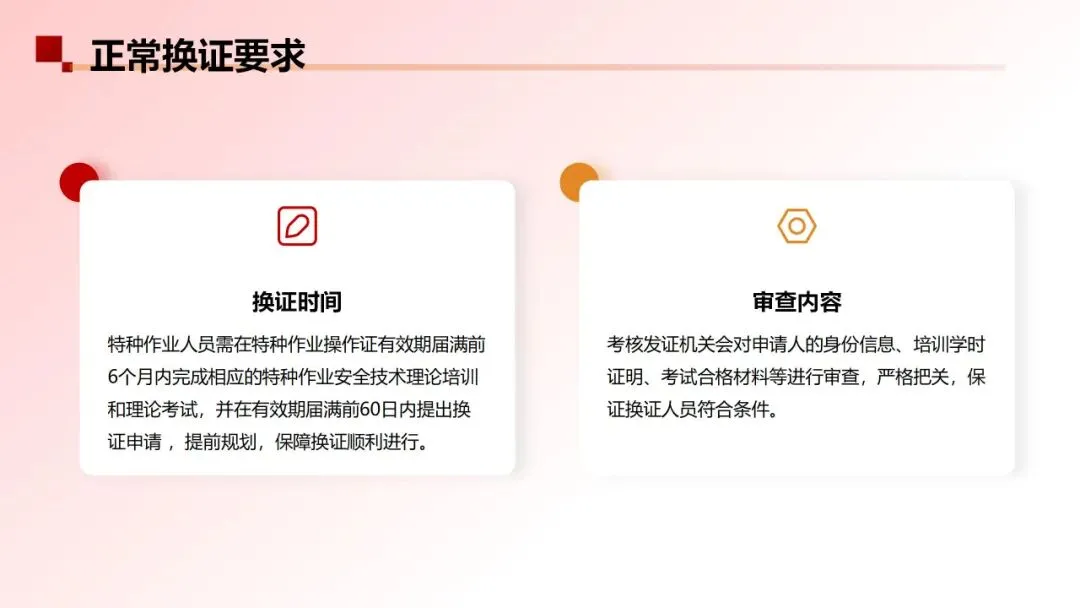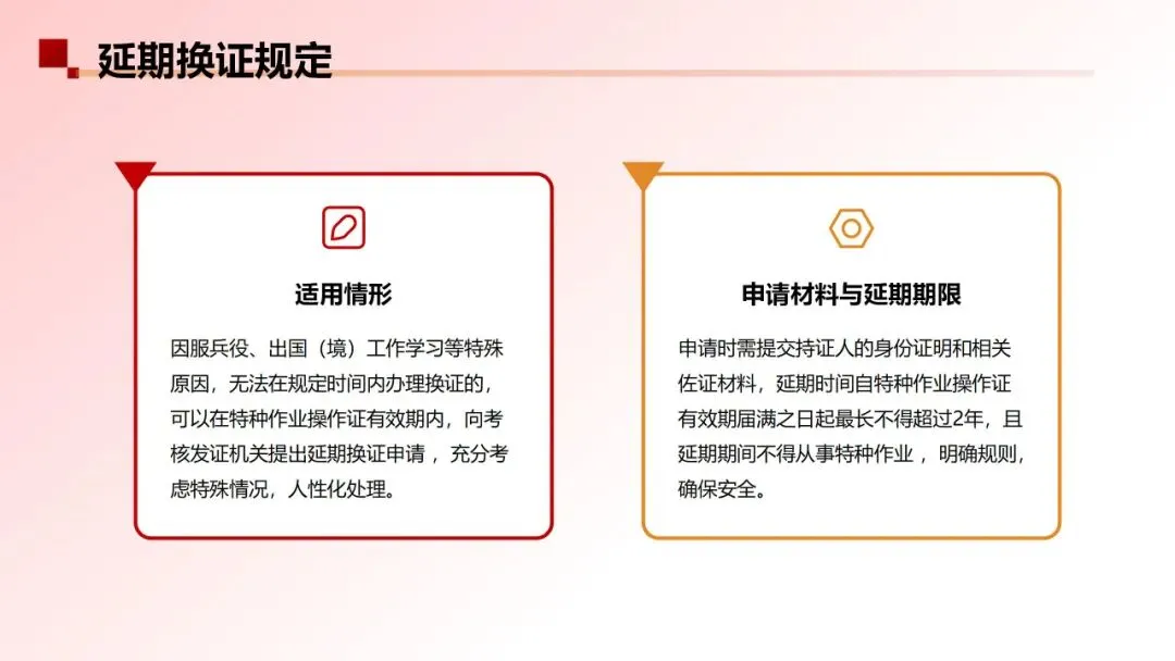 取消特种作业操作证每3年一复审,改为每6年一换证。明确因服兵役、出国(境)工作学习等特殊原因无法在规定时间内办理换证的特种作业人员,可以在特种作业操作证有效期内向考核发证机关提出延期换证申请,并提交持证人的身份证明和相关佐证材料。延期时间自特种作业操作证有效期届满之日起最长不得超过2年。延期期间不得从事特种作业。