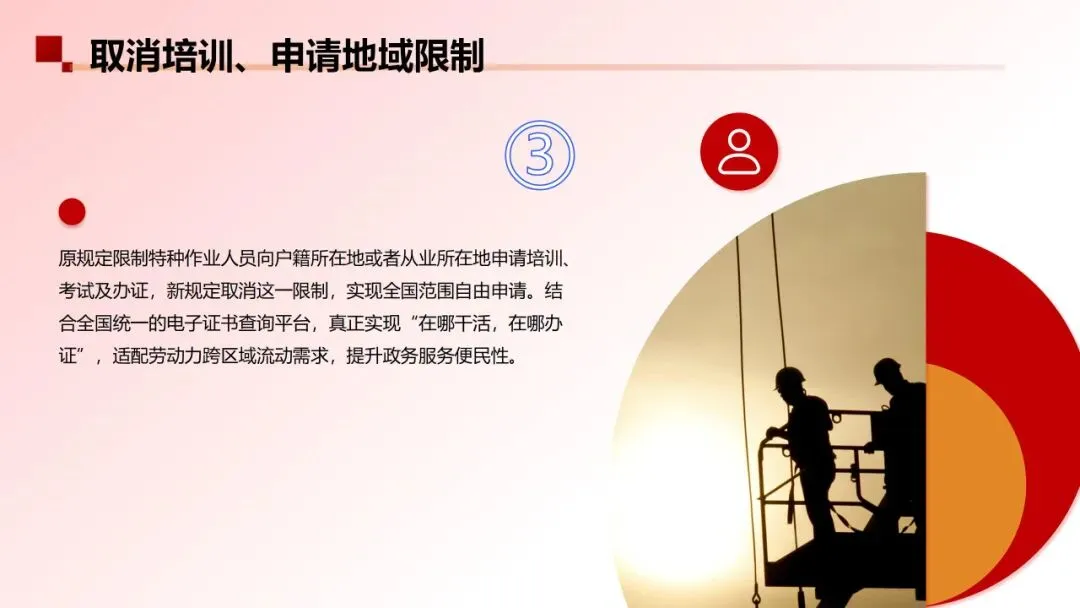 新规定则取消了这一地域限制,实现培训、申请取证等业务不受区域约束。结合全国统一的电子证书查询平台,特种作业操作证在全国范围内有效通用,进一步适配了劳动力跨区域流动的现实需求,大幅提升了政务服务的便民性。