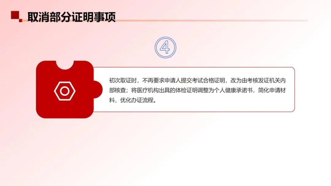初次取证时,不再要求申请人提交考试合格证明,改为由考核发证机关进行内部核查,并将医疗机构出具的体检证明调整为个人健康承诺书。