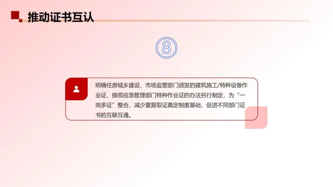 明确“住房城乡建设、市场监管部门颁发的建筑施工/特种设备作业证,换领应急管理部门特种作业证的办法另行制定”,为后续“一岗多证”整合、减少重复取证奠定制度基础。