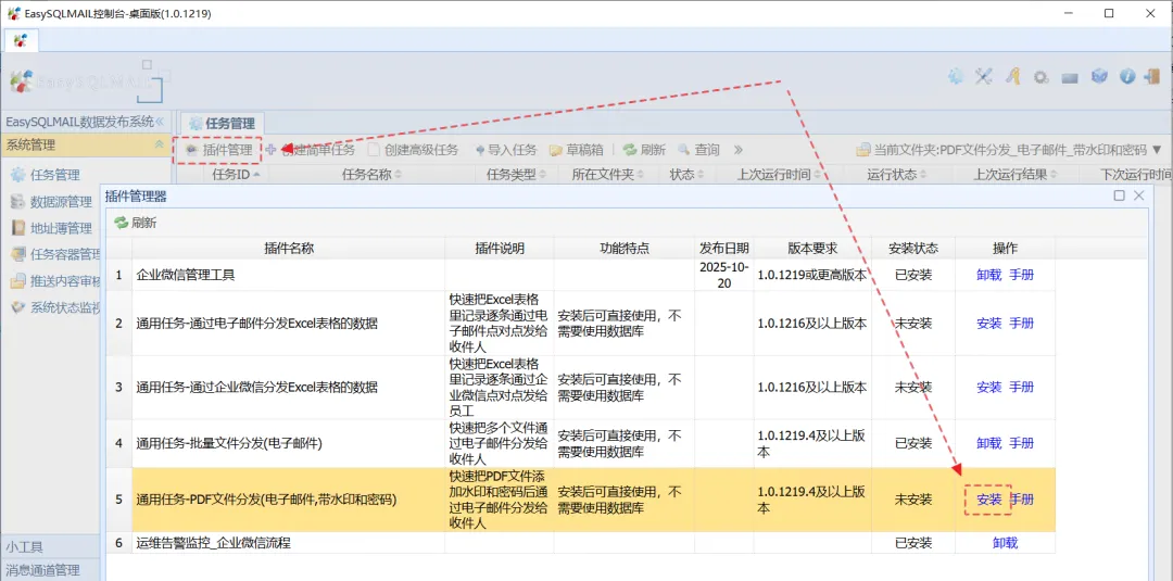 首次使用时,需要在“插件管理”中安装“PDF文件分发(电子邮件,带水印和密码)”插件。