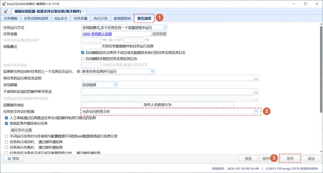 提示:桌面版用户安装插件后请按以下步骤编辑“批量文件分发任务(电子邮件)”的任务配置,在任务的“高级选项”中修改“任务的文件访问权限”选项。也可以与EasySQLMAIL客服联系获取已修改过的配置文件。企业版用户不建议修改此选项。