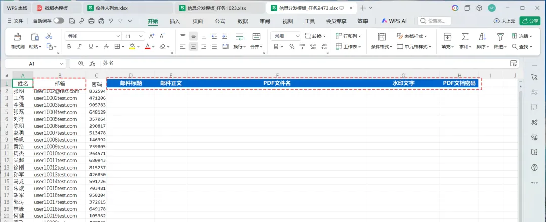 2.2 在模板表格中填写要发送的文件名、收件地址和邮件的标题以及正文和水印文字及PDF文档密码。这里可以把您已经准备好的收件人列表复制到模板表格里。要确保表格中有“邮箱”、“邮件主题”、“邮件正文”、“PDF文件名”、“水印文字”和“PDF文档密码”这几个字段。