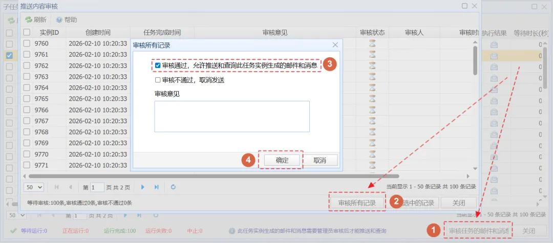 2.6 确认邮件内容无误后,点击“审核任务的邮件和消息”按钮,然后点击“审核所有记录”,勾选“审核通过”,点击“确定”。这时系统开始发送这些邮件。
