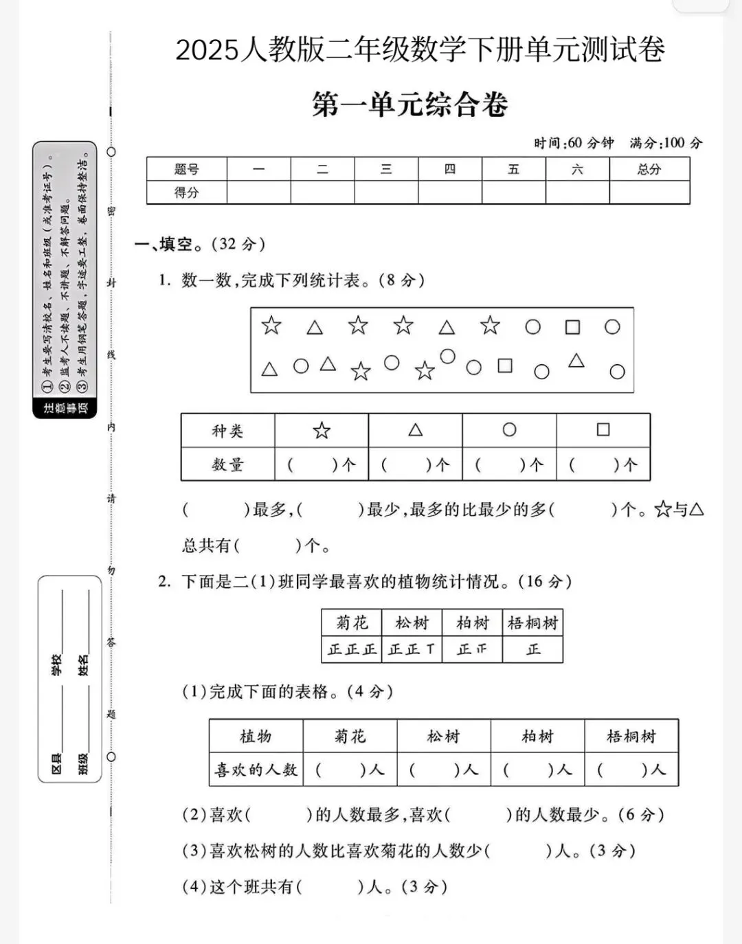 📚二年级数学|人教版下册第一单元测试卷分享~