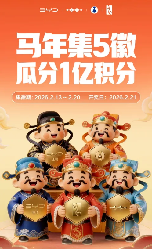 马年开好运,比亚迪 APP「马年集 5 徽 瓜分 1 亿积分」活动今天正式开玩啦,集徽期为 2026 年 2 月 13 日至 2 月 20 日,2 月 21 日财神节当天开奖。