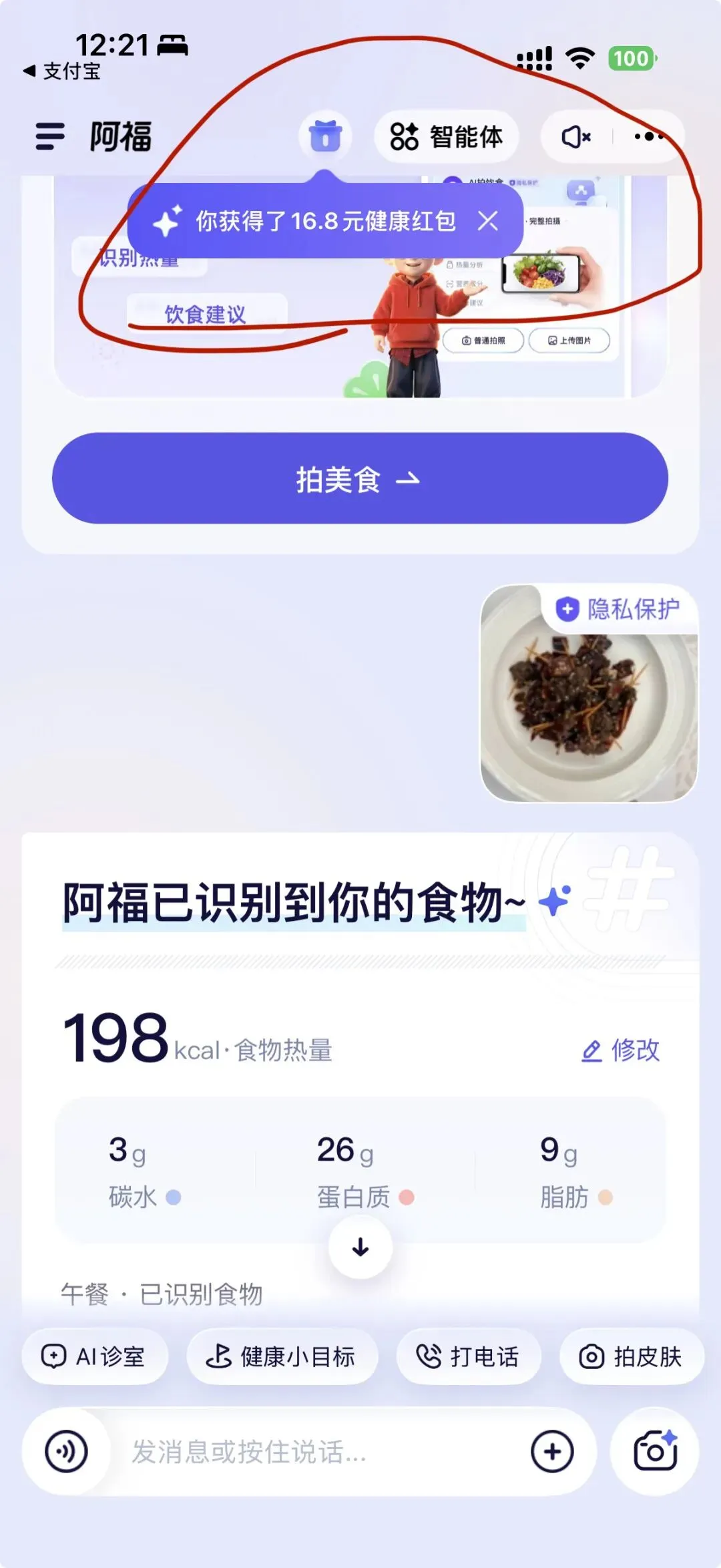 随手拍张照让阿福给你检测下“热量”,即可获得红包啦,超简单的!(手机里存的美食照片也可以的✌️)