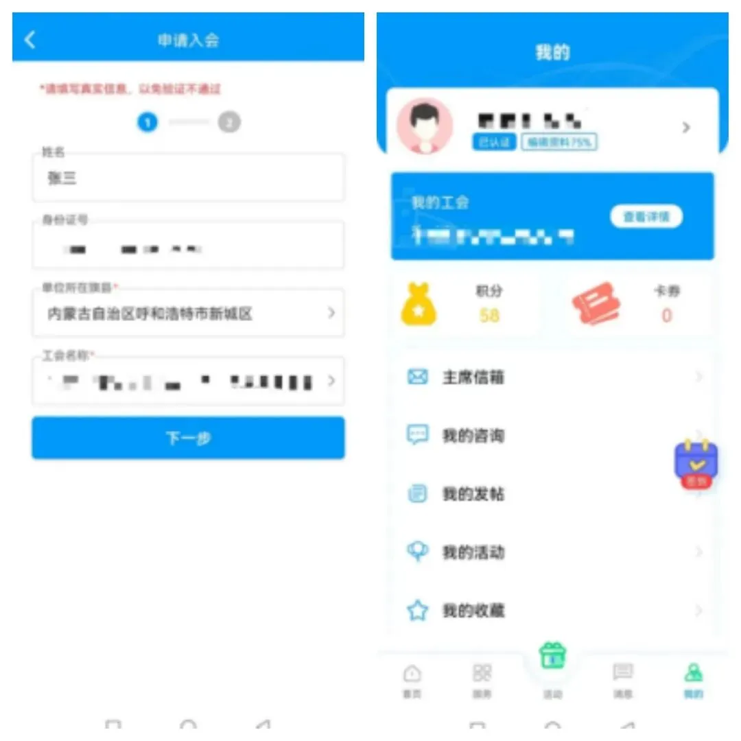 2.完成实名认证并加入所在工会(入会时“所属群体”需选择为活动对应的职工群体)
