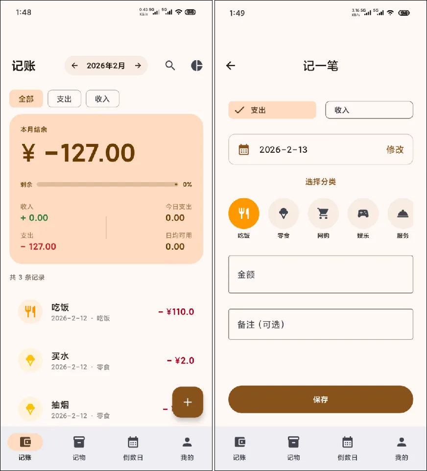 这款完全免费切本地存储的记账App,让记账不再是负担。打开 App,点击 “记一笔”,选择 “支出” 或 “收入”,输入金额,一秒就能完成记录。让每一笔消费都有迹可循再也不用等到月底才惊觉 “钱都去哪了”。