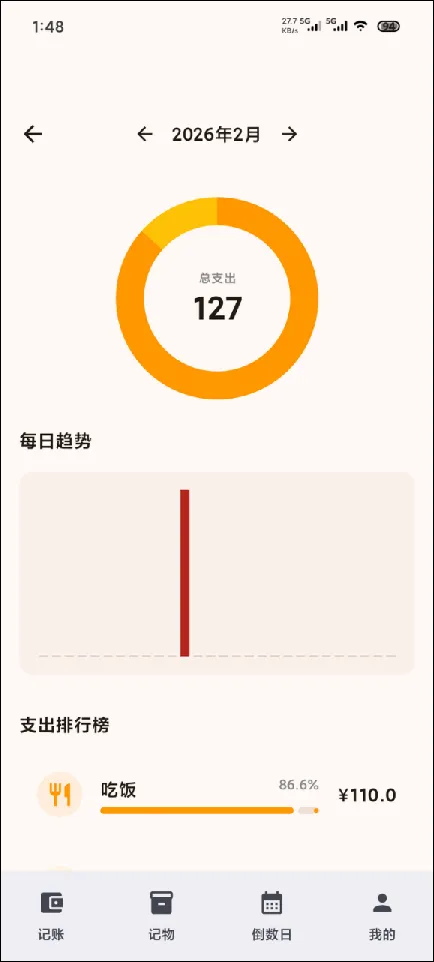 它不只是一个记账本,更是你的私人财务分析师。通过环形图、每日趋势和支出排行榜,你能清晰看到钱都花在了哪里。比如,你会发现 “吃饭” 占了本月支出的 86.6%,从而及时调整消费习惯。
