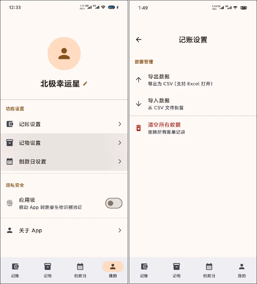 对于记账 App 来说,数据安全至关重要。这款 App 提供了完善的数据管理功能:支持将账单导出为 CSV 文件,方便你在 Excel 中进行深度分析,也可以从 CSV 文件恢复数据,换机也不怕数据丢失。也可以一键清空所有记录,操作简单又安全。