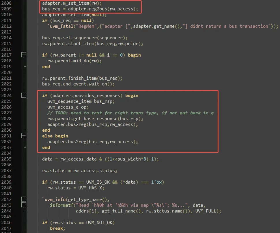 reg2bus实现了将寄存器模型的uvm_reg_bus_op类型的数据转化为具体协议的transaction类型给到sequencer,sequencer将这个uvm_sequence_item类型的数据$cast成对应协议的transaction给到driver,driver将该transaction驱动到总线上再执行seq_item_port.item_done()标志一次总线操作的结束,即图1中的2022行等待的结果。然后adapter中的bus2reg会被调用执行,函数参数是用原始给到driver的transaction(即req)还是driver返回的transaction(rsp,如果有put_response(rsp)或者seq_item_port.item_done(rsp)带参数)由上文提到的provides_responses变量决定,这段代码实现即图1中的2024-2033行。